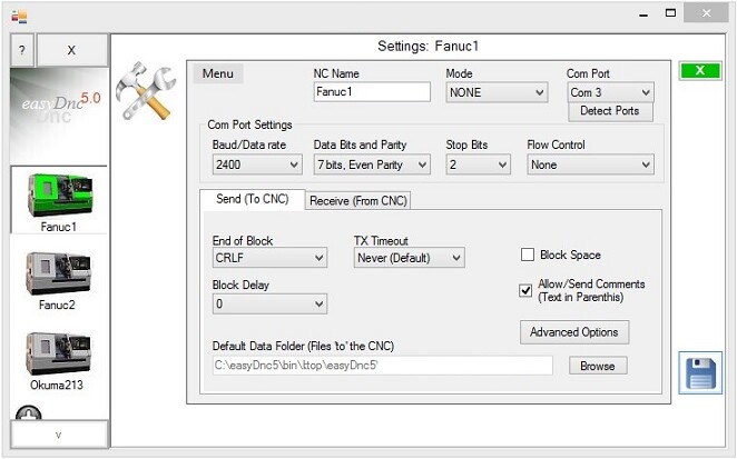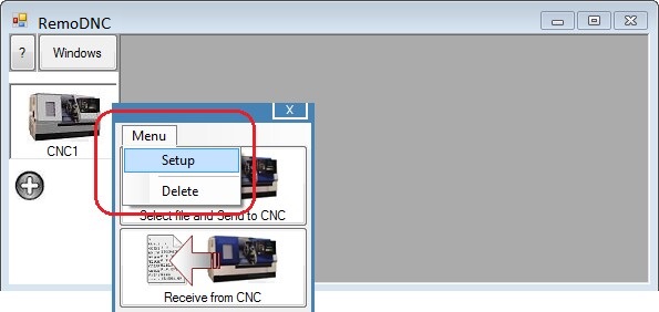 Installation - Setup In most case RemoDNC will be installed using our downloadable installer package available from our website at www.easydnc.com When the installation process is complete you'll find RemoDNC icons in your windows start menu and on your Windows Desktop. The first time you use RemoDNC it will show one CNC icon in the panel. You can add more CNC icons by clicking the (+) button. Each CNC icon is a machine profile. It contains the DNC configuration for one CNC. To edit a machine profile you click the CNC icon and select "Setup" from the menu.