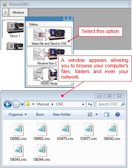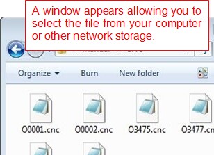 If you select the option to Send to CNC a window appears where you can select a file. It's the same as the Windows Explorer so you can navigate around your computer's folders or even your network to select your file.